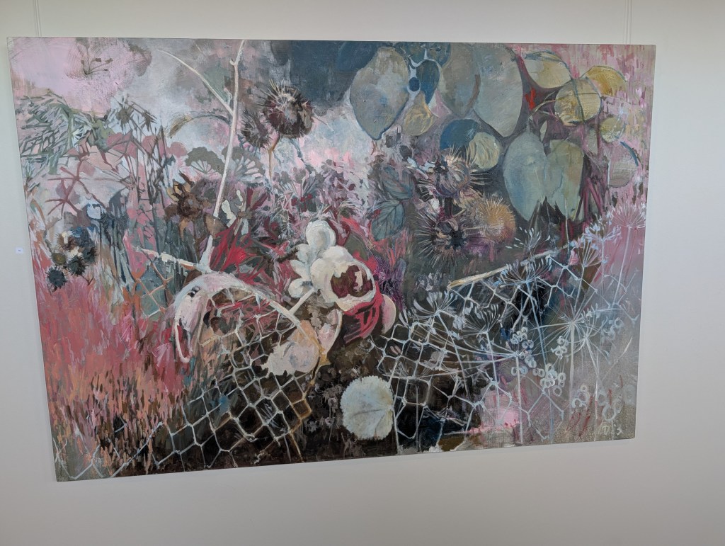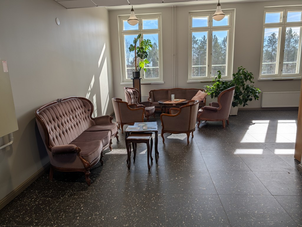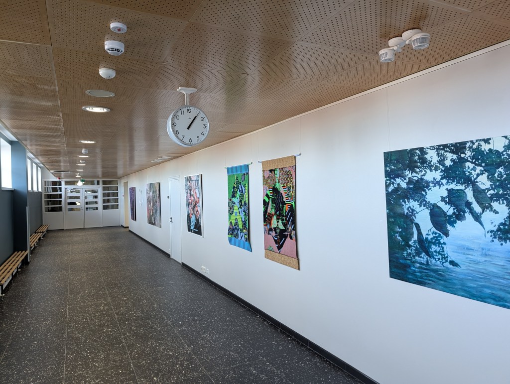 Yhdellä käytävällä on tauluja ja kyltti Myyntinäyttely. Se taitaa varmaan kuitenkin vasta olla tulossa. Tarpeelliset tiedot puuttuvat. Kuvan taulujen tekijää/tekijöitä en siis tiedä. Pahoittelen. Näyttelyitä ja tapahtumia talossa tullaankin järjestämään.