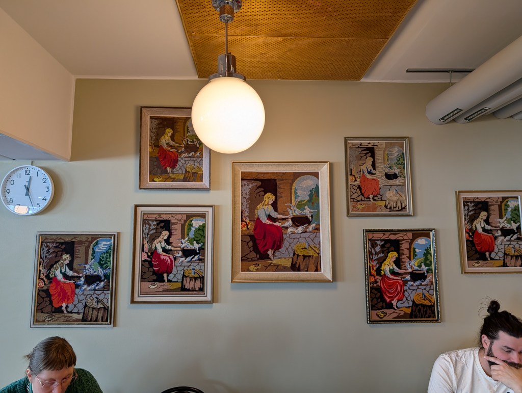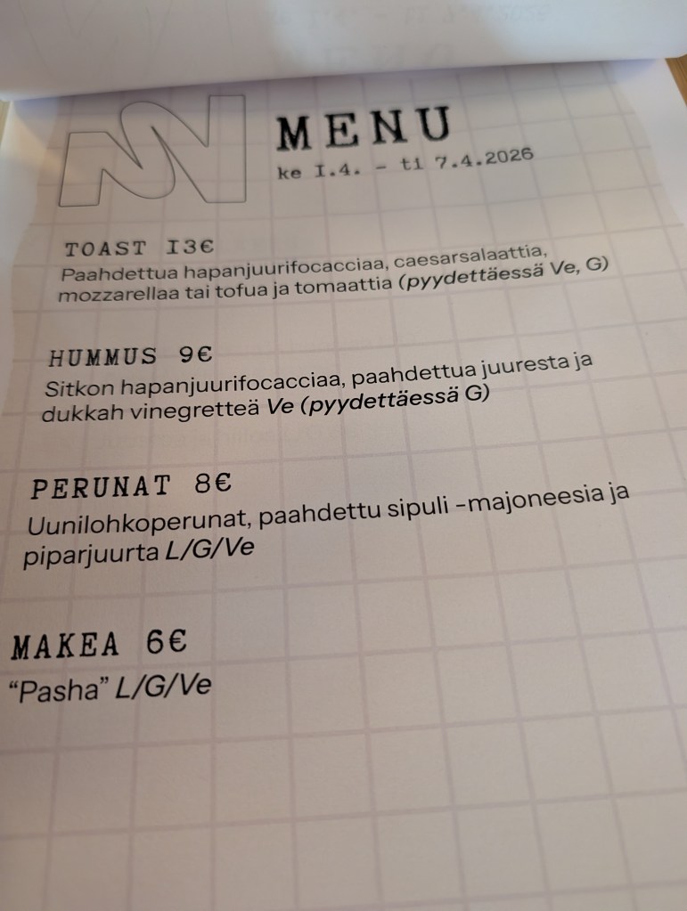 Lounaslista on vaatimaton, joskin laajempi kuin tämä yksi sivu. Mies taitaa syödä jonkun burgerin, minä muistaakseni toastin.