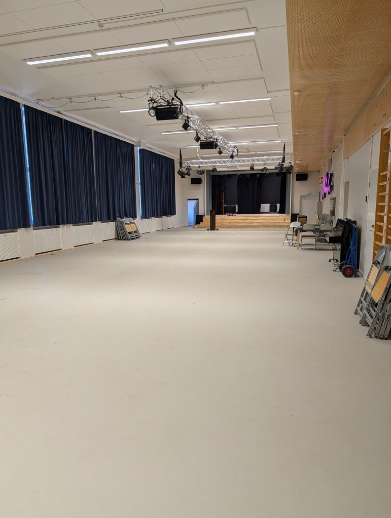 Juhlasaliin mahtuu monia tapahtumia ja paljon ihmisiä. On näyttämökin. Koulun peruja.