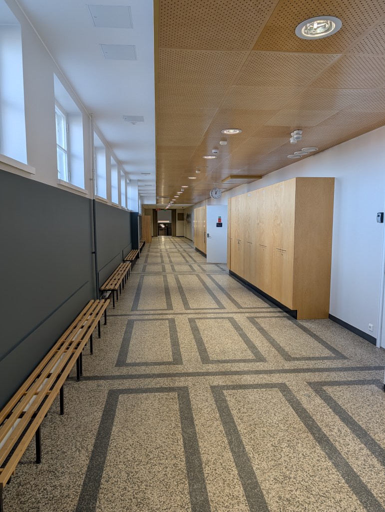 Ovia pitkien käytävien varrella on useassa kerroksessa. Työtiloja, arvelen. Satunnaista kulkijaa lukuunottamatta käytävät ovat tyhjät. Voihan sitä ovien takana toki olla vaikka mikä työn tohina.