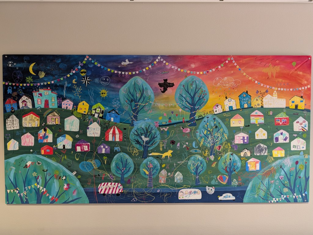 Seinällä on kaunis taideteos. Kyseessä on kuvataiteilija Giannetta Portan johdolla työpajassa tehty yhteisötaideteos. Se on tehty Viinikkafestareilla 2024 ja kuvaa Nekalan ja Viinikan tulevaisuutta kulttuurikaupunginosana.