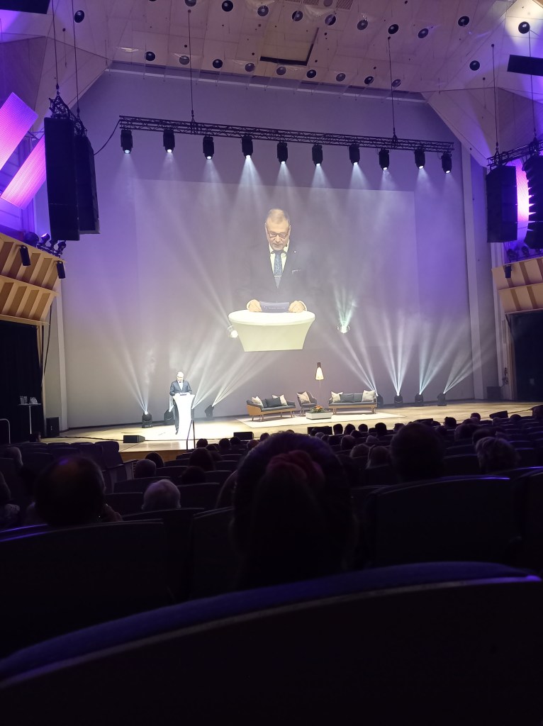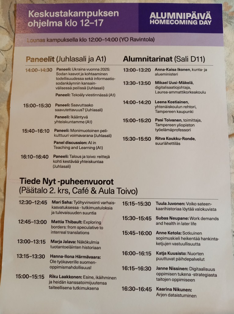 Kun minut johonkin bileisiin kutsutaan, niin minähän menen hypyn kengässä. Ellei nimittäin ole todellista estettä. Koko päivä lauantaina 8.11.25 oli yhtä juhlaa. Alumnipäivä eli entisten opiskelijoiden päivä alkoi Tampere-talossa aamukahvilla ja suolapalalla. Tutustuin siellä heti Seinäjokiseen Helinään, joka oli Kuortaneelta kotoisin. Meillä Etelä-Pohojalaasilla synkkasi heti niin hyvin, että kuljimme juhlassa lähes koko ajan ”käsi kädessä”.