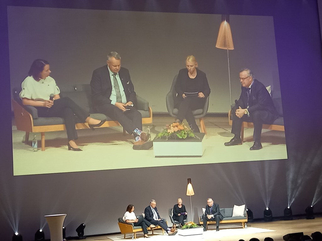 Paneelissa Digitaalinen valta ja geopolitiikka keskustelivat Suomen Saksan-suurlähettiläs Kai Sauer, Teknologiteollisuus ry:n hallituksen puheenjohtaja Ville Voipio ja Tampereen yliopiston apulaisprofessori Rinna Kullaa, joka toimi myös keskustelun moderoijana eli keskustelun johdattelijana. Yksi mielenkiintoisimmista kysymyksistä oli: johtaako politiikka teknologiaa vai teknologia politiikkaa. Sauerin mukaan politiikka johtaa, Voipion mukaan molemmat. Kullaan näkemystä en muista. Voipio osoittautui historiansa tuntevaksi. Kullaakin, joka on historian professori, naureskeli välillä, että kuka se tässä sen alan asiantuntija onkaan. Huumoria oli muutenkin keskusteluissa kivasti. Voipion mukaan yliopiston tehtävä on opettaa oppimaan tulevaisuudessakin tarvittavia taitoja. Ihan jees näkemys. Allekirjoitan. Tiedä sitten, opinko itse sitä yliopisto-opinnoissani.